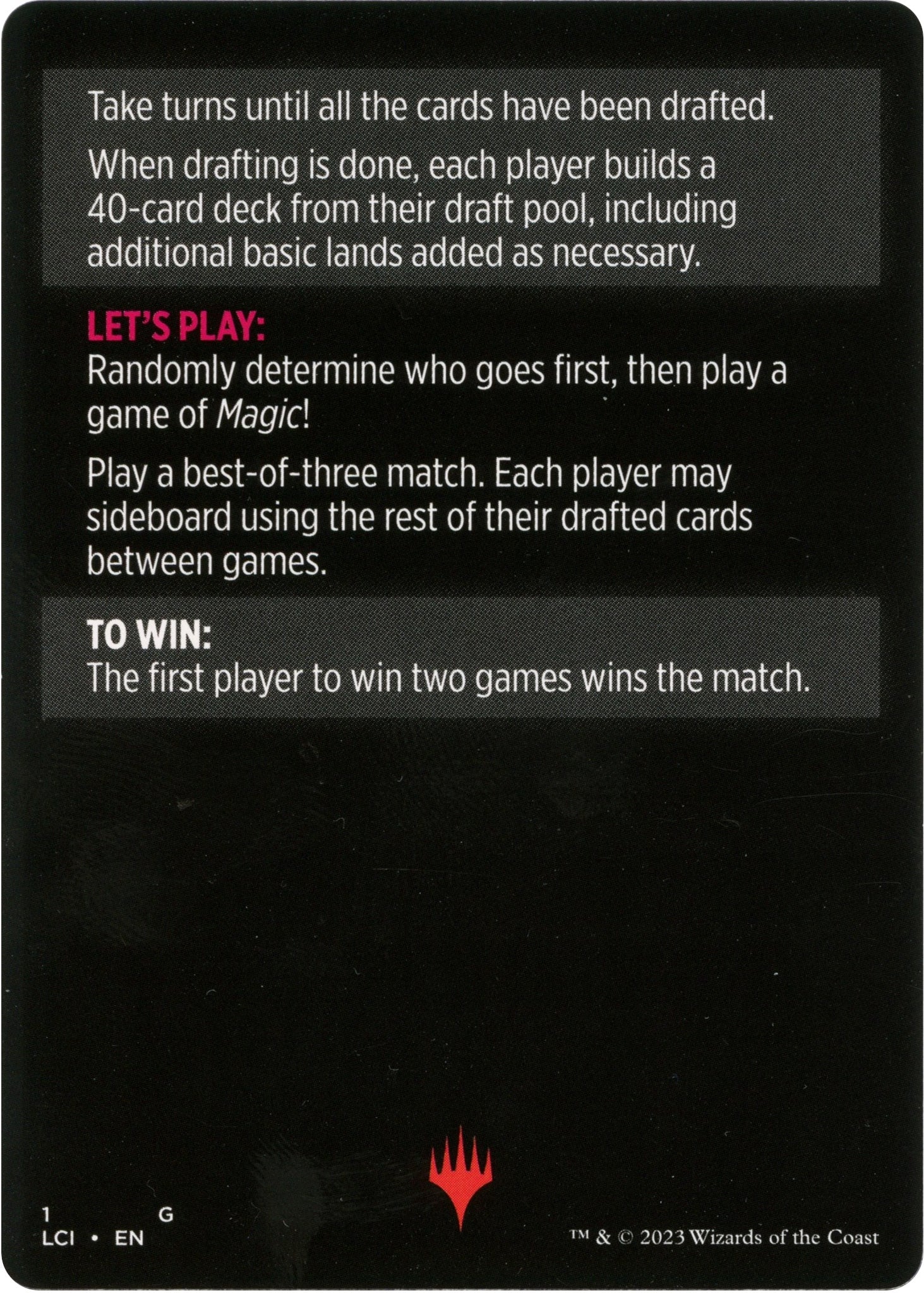 When drafting is done, each player builds a 40-card deck from their draft pool, including additional basic lands added as necessary.